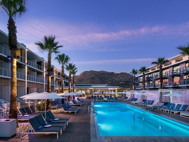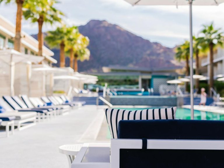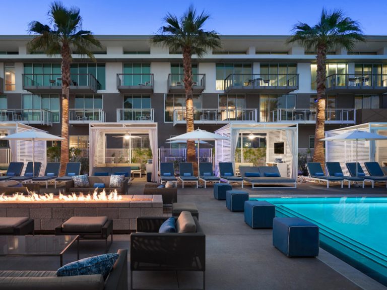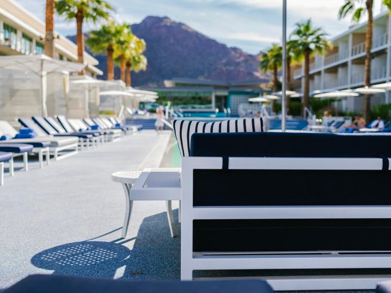 A modern resort poolside featuring custom chaise loungers, cabanas, and fire-pit lounge areas at Mountain Shadows Resort.