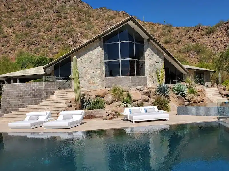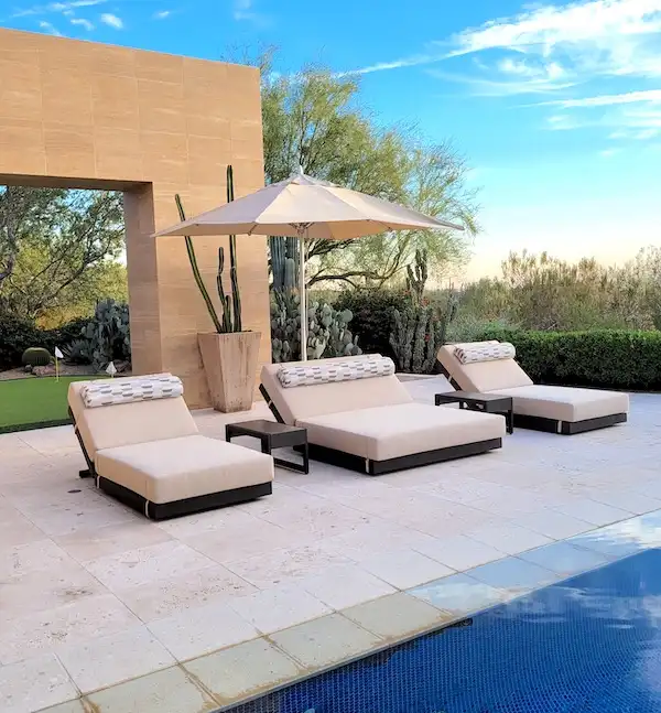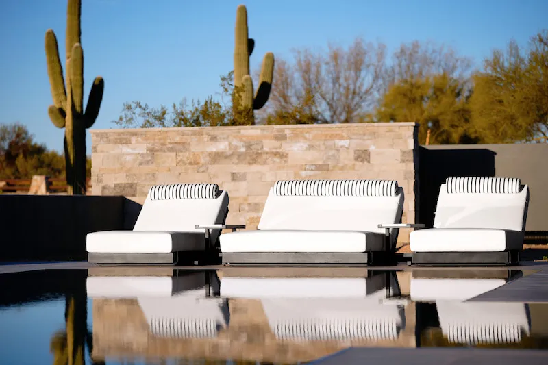 A luxury desert estate featuring custom sectional seating, striped daybed, outdoor bar dining, and a signature porch swing.