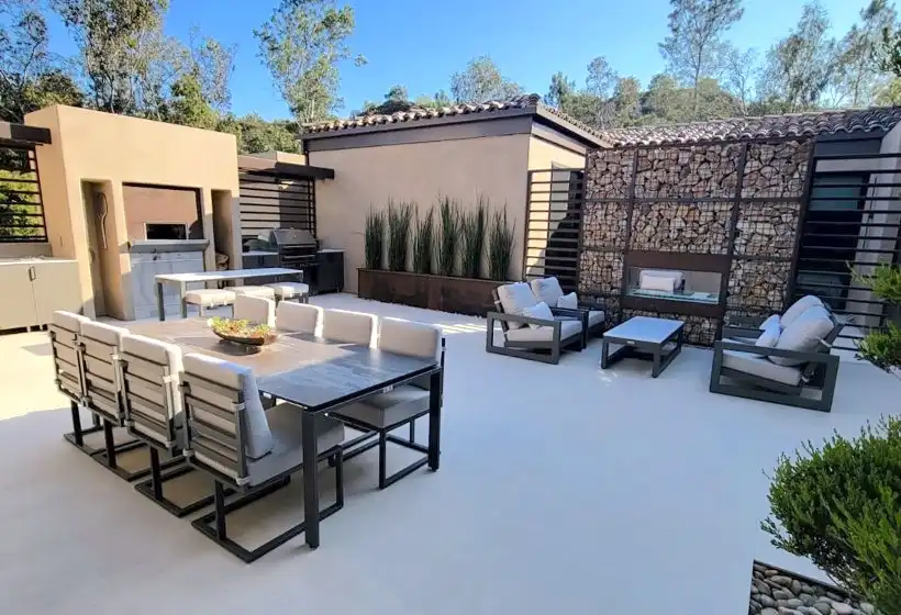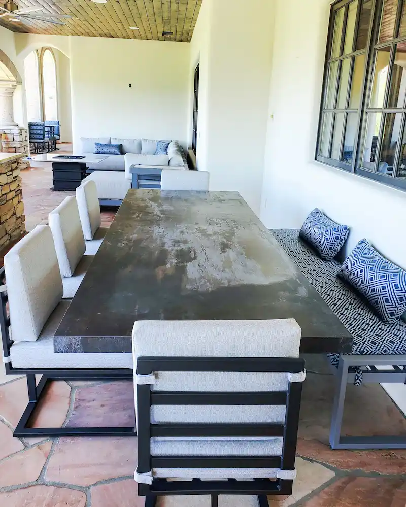 A luxury desert estate featuring custom sectional seating, striped daybed, outdoor bar dining, and a signature porch swing.